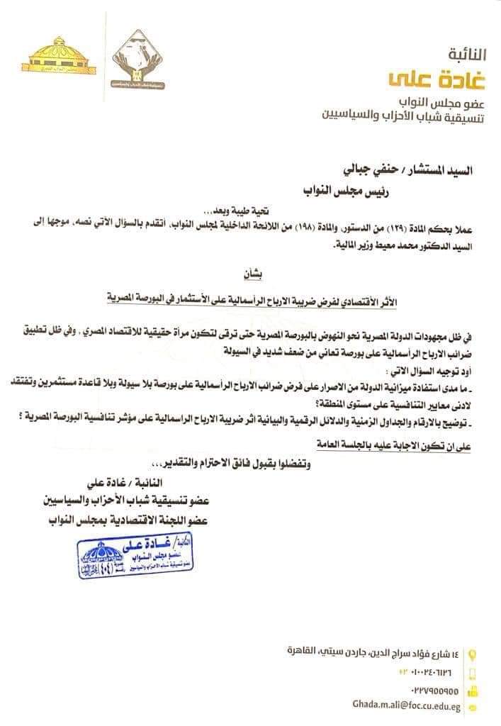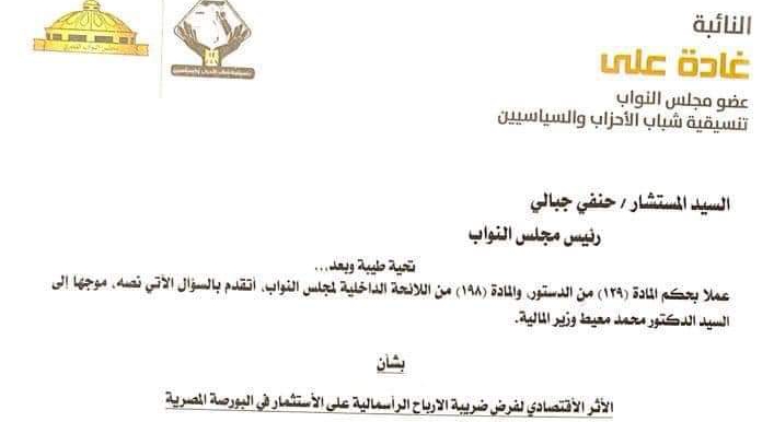 عملا بحكم المادة (129) من الدستور، والمادة (198) من اللائحة الداخلية لمجلس النواب، تقدمت الدكتوره غاده علي ، موجها إلى السيد الدكتور محمد معيط وزير الماليه بشأن