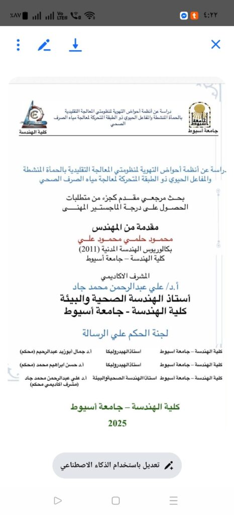 «دراسة عن أنظمة أحواض التهوية لمنظومتي المعالجة التقليدية بالحمأة المنشطة والمفاعل الحيوي ذو الطبقة المتحركة لمعالجة مياه الصرف الصحي»، حيث تناولت دراسة مقارنة متقدمة بين النظم التقليدية والحديثة في معالجة مياه الصرف، بما يسهم في تحسين كفاءة التشغيل وتقليل الأثر البيئي لمحطات المعالجة.