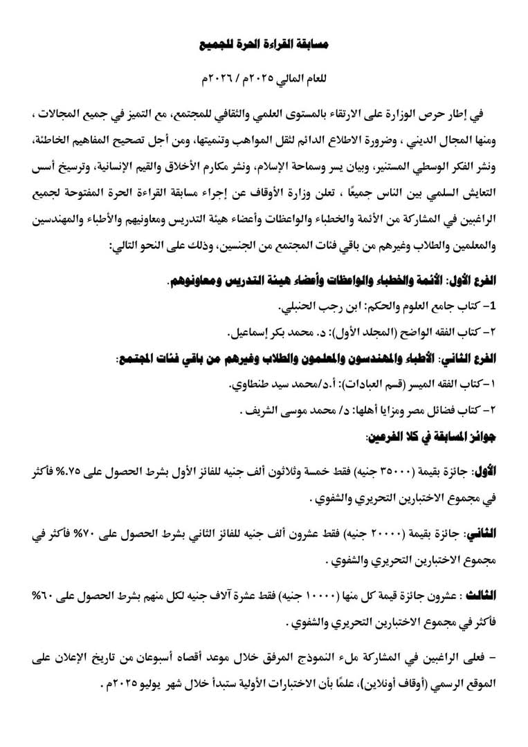 تعلن وزارة الأوقاف عن إطلاق مسابقة القراءة الحرة المفتوحة لجميع فئات المجتمع من الجنسين، وذلك في إطار سعيها الدءوب للارتقاء بالمستوى العلمي والثقافي، وتعزيز التميز في مختلف المجالات، لاسيما المجال الديني، ودعم ثقافة الاطلاع والمعرفة.