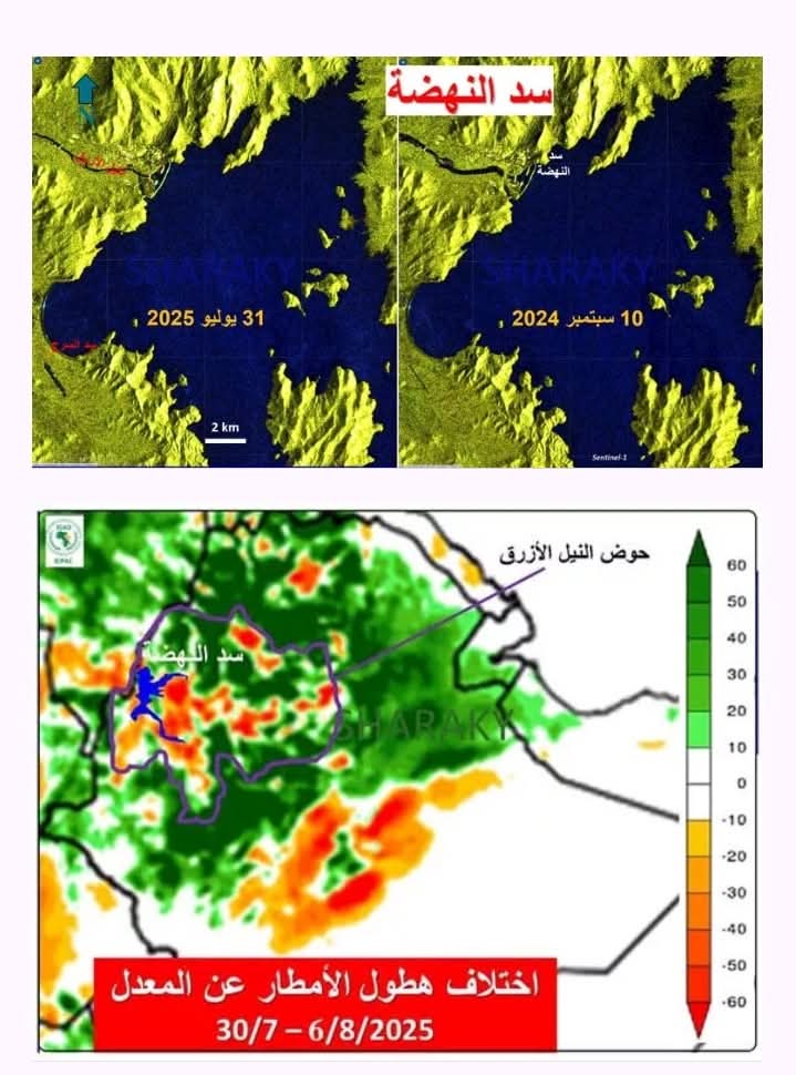 قال الدكتور عباس شراقي، أستاذ الجيولوجيا بجامعة القاهرة، إن معدل هطول الأمطار انخفض قليلًا على بعض المناطق في حوض النيل الأزرق الذي يقع بداخله سد النهضة خلال يوليو، مما أخر مرور المياه من أعلى الممر الأوسط أيام قليلة،وأضاف “شراقي”، عبر صفحته على “فيسبوك”، أن ذلك سيستمر خلال الأسبوع المقبل فقط طبقًا لتقديرات مركز إيجاد IGAD للتنبؤات المناخية والتطبيقات لتوقعات الأمطار.