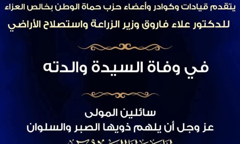 تقدم اللواء طارق بركات، مساعد رئيس الحزب وأمين عام حزب حماة الوطن بالبحيرة، واللواء جمال عبدالعاطي، عضو مجلس النواب وأمين تنظيم المحافظة وكيل لجنة الدفاع والأمن القومي، بخالص العزاء للدكتور علاء فاروق، وزير الزراعة واستصلاح الأراضي، في وفاة والدته.