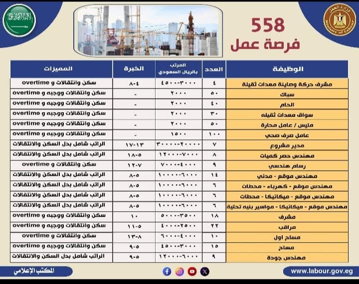 الهندسى بإحدى شركات المقاولات بالملكه العربيه السعوديه ، بالتنسيق مع مكتب التمثيل العمالى بالرياض ،والاداره المركزيه للعلاقات الدولية والإدارة العامة للتشغيل…….